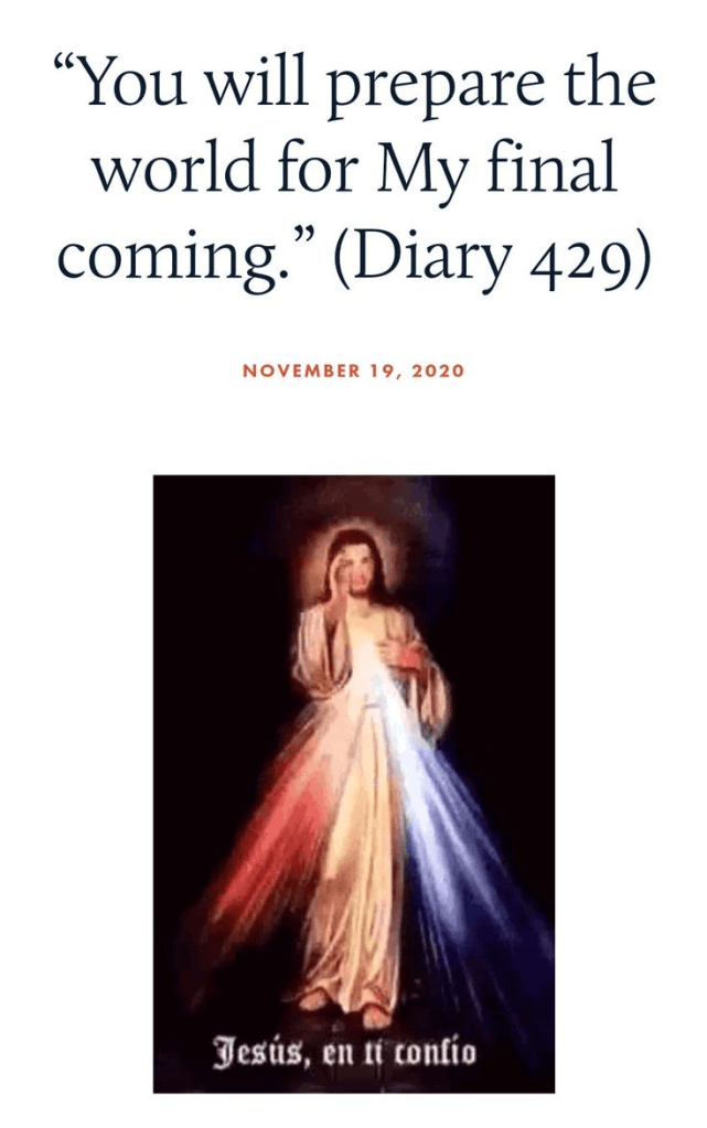 See https://www.thedivinemercy.org/ for more background on the Divine Mercy and the Diary of St. Faustina Maria Kowalska, Divine Mercy in My Soul.